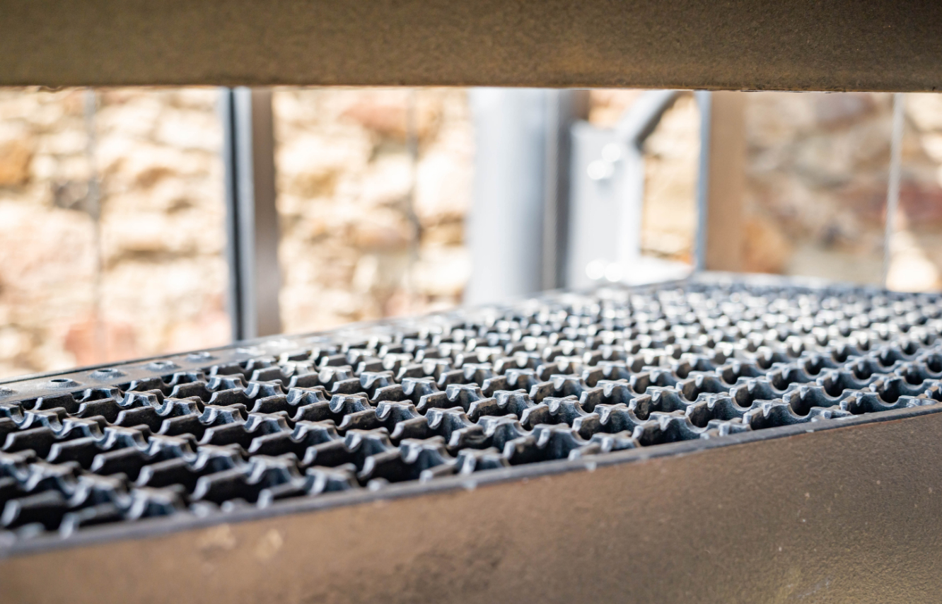Ступени лестницы усилены специальным профилем с нескользящей ступеней с двумя рядами перфораций. Выемки по бокам лестницы облегчают сборку лестницы и имеют винты. Наша сфера деятельности – производство нетипичных форм решеток и ступенек со скосами, вырезами для труб и других колонн. Нетрадиционные формы могут быть изготовлены из прессованных, сварных решеток, а также просечно-вытяжного листа.